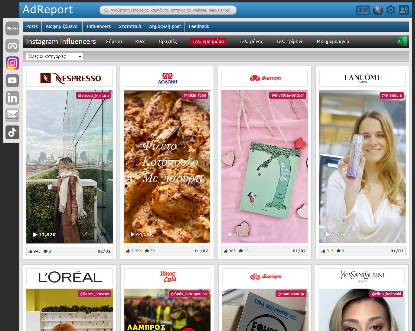 Με τη σημερινή αναβάθμιση, η ίδια λογική επεκτείνεται και στο Instagram. Πλέον μπορείτε να γνωρίζετε τους influencers με τις περισσότερες διαφημιστικές αναφορές, με ποια πρόσωπα συνεργάζεται κάθε εταιρεία, ποιους προτιμά ο κάθε κλάδος και πολλά άλλα. Accounts, hashtags και mentions αποτελούν πλέον τμήμα της πληροφορίας που μπορεί να ενσωματωθεί στα reports που εξάγονται από τους χρήστες του AdReport.