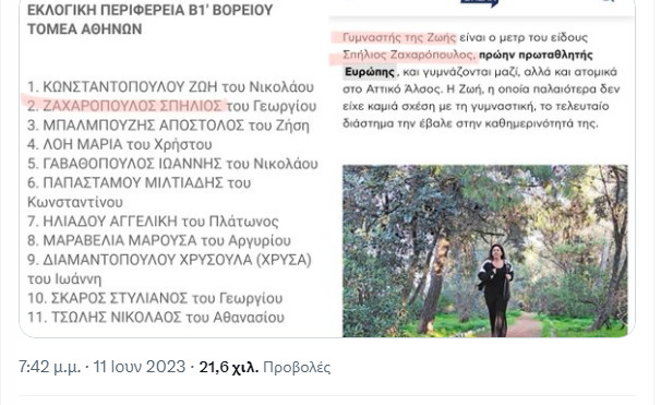 Τελευταίο παράδειγμα όσα αναφέρει ο γνωστός χρήστης του Twitter, Georghy Zhukov, που με ανάρτησή του επισημαίνει ότι η Ζωή Κωνσταντοπούλου τοποθέτησε τον προσωπικό της γυμναστή, Σπήλιο Ζαχαρόπουλο, στη δεύτερη θέση του ψηφοδελτίου της εκλογικής περιφέρειας Β1′ στον βόρειο τομέα Αθηνών.