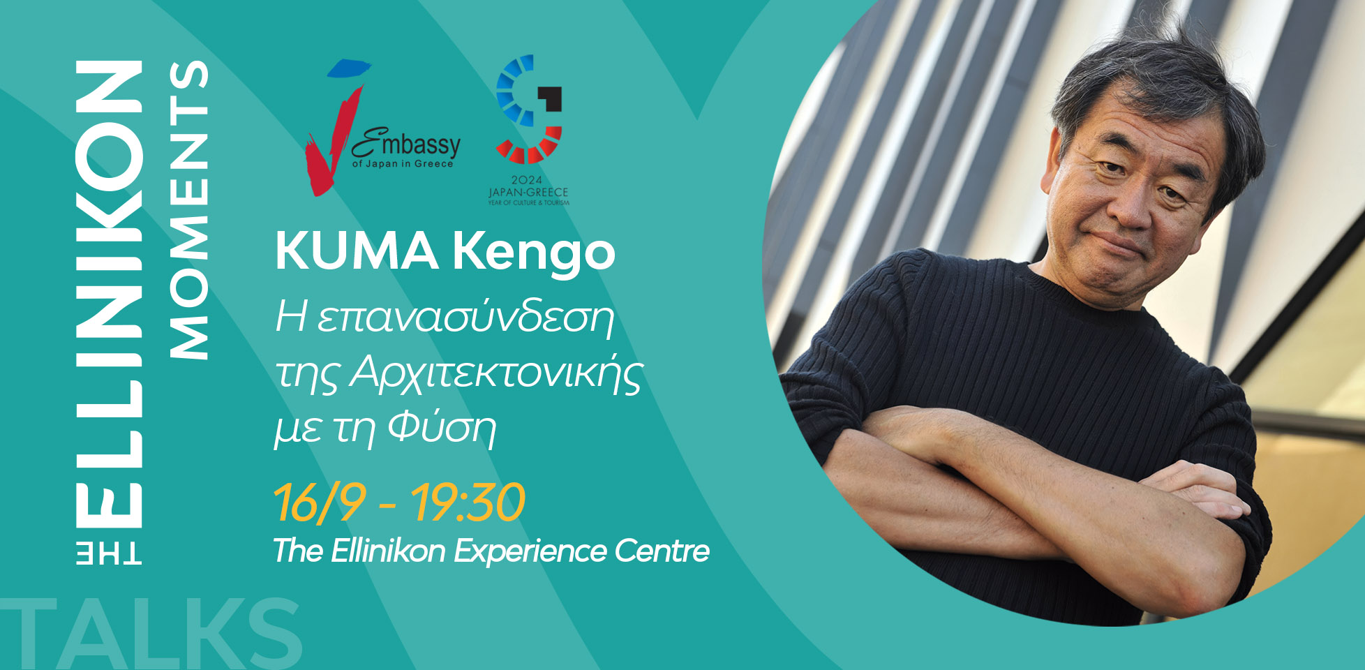 Η Πρεσβεία της Ιαπωνίας στην Ελλάδα σε συνεργασία με την LAMDA Development, στο πλαίσιο των δράσεων για το «2024: Έτος Πολιτισμού και Τουρισμού Ιαπωνίας – Ελλάδας» και της ενότητας “Talks” του θεσμού “The Ellinikon Moments”, υποδέχεται την Δευτέρα 16 Σεπτεμβρίου, για μια μοναδική ομιλία, τον διεθνούς φήμης αρχιτέκτονα KUMA Kengo.