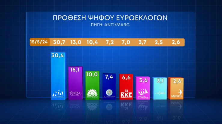 Προβάδισμα 16,9 μονάδων για τη Νέα Δημοκρατία στην εκτίμηση αποτελέσματος για τις ευρωεκλογές της 9ης Ιουνίου δίνει η τελευταία δημοσκόπηση της εταιρείας Marc που έγινε για λογαριασμό του ANT1 και παρουσιάστηκε στο κεντρικό δελτίο ειδήσεων του τηλεοπτικού σταθμού. Η διαφορά της ΝΔ είναι μεγαλύτερη από το ποσοστό που δίνει η εταιρεία στο κόμμα της αξιωματικής αντιπολίτευσης, 16,5%.