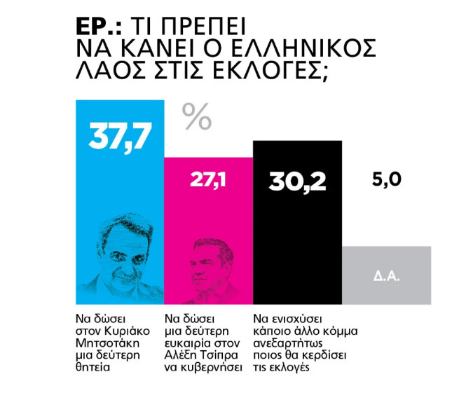 Το συνολικό ποσοστό των πολιτών που πιστεύουν ότι στις κάλπες της 21ης Μαΐου οι Ελληνες πρέπει να δώσουν δεύτερη ευκαιρία στον κ. Μητσοτάκη φτάνει στο 37,7% και είναι κατά 10,6 μονάδες μεγαλύτερο από εκείνους που πιστεύουν ότι πρέπει να γίνει το ίδιο με τον κ. Τσίπρα. Στο 30,2% φτάνει το ποσοστό όσων αδιαφορούν για τον νικητή ανάμεσα στους δύο μονομάχους και προκρίνουν την ενίσχυση κάποιου από τα άλλα κόμματα.