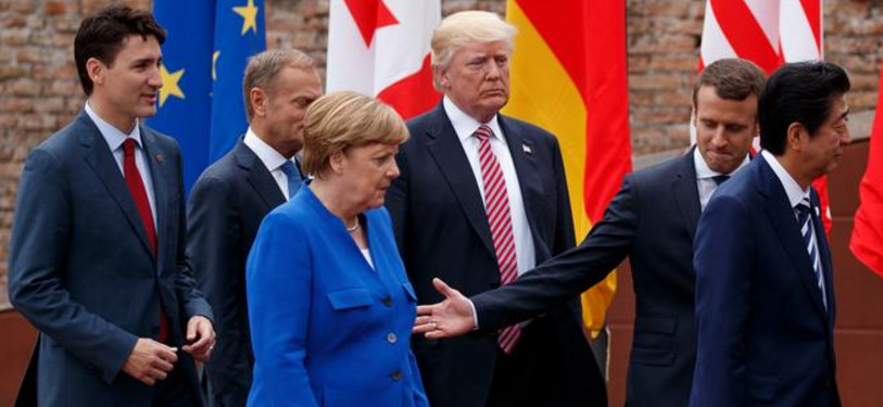 Τέσσερεις νέοι πρωθυπουργοί κρατών συναντώνται για πρώτη φορά στο πλαίσιο των G7, δηλώνει ο Ζαν Κλοντ Γιούνκερ, εννοώντας τον γάλλο πρόεδρο Εμμανουέλ Μακρόν, την βρετανίδα πρωθυπουργό Τερίζα Μέι, τον ιταλό πρωθυπουργό Πάολο Τζεντιλόνι και τον αμερικανό πρόεδρο Ντόναλτ Τραμπ. Έμμεσα πάντως ο Ζαν Κλοντ Γιούνκερ επιβεβαιώνει την δήλωση Ντ. Τραμπ για το εμπορικό πλεόνασμα της Γερμανίας, ότι δηλαδή, οι γερμανοί είναι «κακοί». Εξηγεί ωστόσο ότι, προφανώς, ο Ντ. Τραμπ βλέπει την Γερμανία ως εμπορικό ανταγωνιστή των ΗΠΑ. Όλα αυτά βέβαια καθιστούν δύσκολη την αποστολή της καγκελαρίου Μέρκελ, η οποία αναζητεί στην Ταορμίνα τον κοινό παρανομαστή των συμμετεχόντων. Και για αυτό θα απαιτηθεί όλη η εμπειρία της. Μην ξεχνάμε ότι αυτή η σύνοδος των G7 είναι για την Α. Μέρκελ η δωδέκατη!.