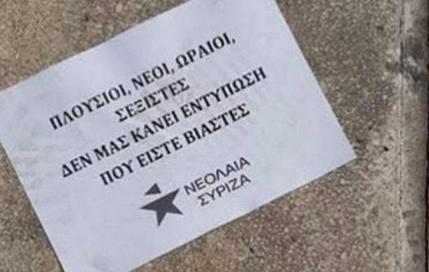 Μπορεί να είναι εικόνα κείμενο που λέει "ΩΡΑΙΟΙ, ΣΕΞΙΣΤΕΣ ΕΝΤΥΠΩΣΗ NEOI, ΠΛΟΥΣΙΟΙ, ΚΑΝΕΙ ΒΙΑΣΤΕΣ ΔΕΝ ΠΟΥ ΜΑΣ ΕΙΣΤΕ ΝΕΟΛΑΙΑ ΣΥΡΙΖΑ ΤΕΛΟΣ ΣΤΗΝ EΛIT ΑΣΥΔΟΣΙΑ ΤΩΝ ΜΕ ΕΙΜΑΣΤΕ ΚΑΘΕ ΓΕΩΡΓΙΑ ΜΑΖΙ ΝΕΟΛΑΙΑ ΣΥΡΙΖΑ"