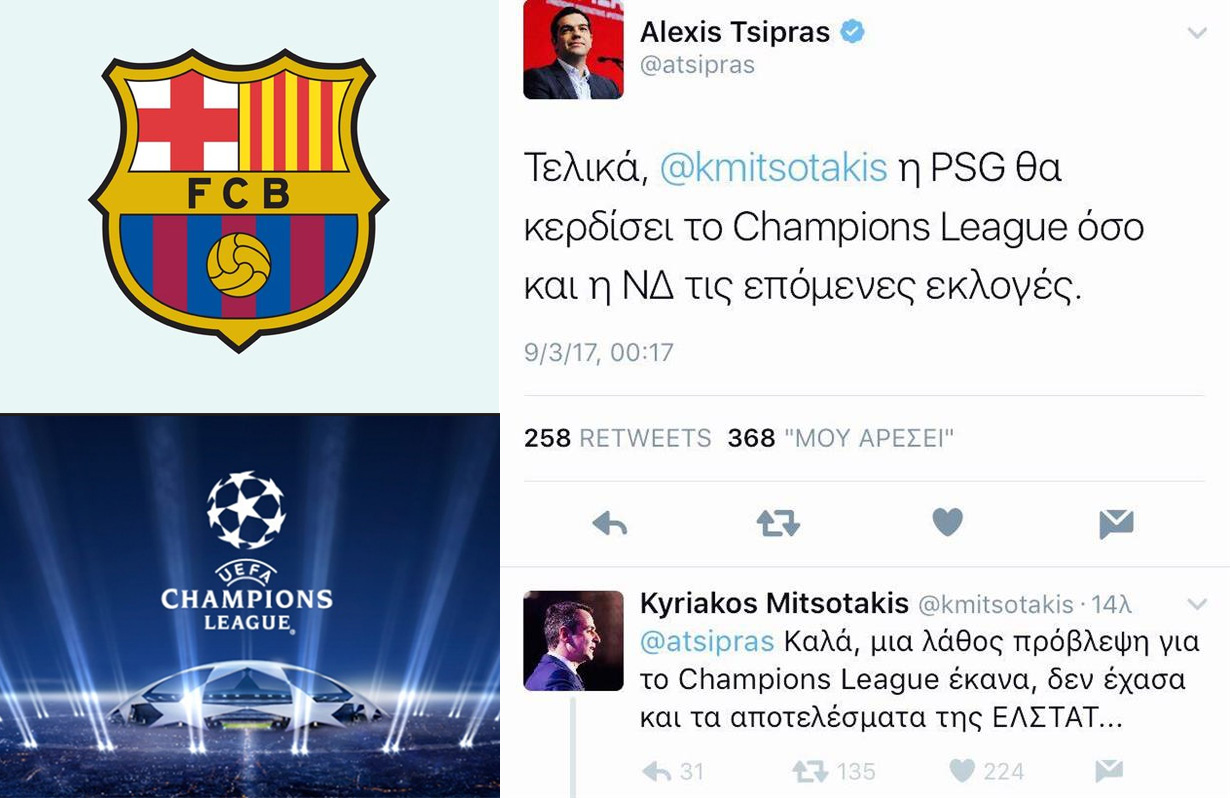 Η πρόκριση της Μπαρτσελόνα στα προημιτελικά του Champions League με 6-1 ενώ στο πρώτο ματς είχε χάσει 4-0 από την Παρί Σεν Ζερμέν κατέπληξε όλο τον πλανήτη. Στην ελληνική πολιτική σκηνή όμως έκανε τον πρωθυπουργό να τρολλάρει επικά τον πρόεδρο της αξιωματικής αντιπολίτευσης και εκείνος με τη σειρά του να του απαντήσει εξίσου καυστικά.