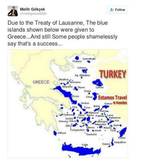 Μετά την αμφισβήτηση της Συνθήκης της Λωζάνης από τον Ερντογάν και το θέμα κυριότητας νησιών και βραχονησίδων που έβαλε το τουρκικό ΥΠΕΞ ο δήμαρχος Melih Gokcek πήγε την τουρκική προκλητικότητα ένα βήμα πιο πέρα.