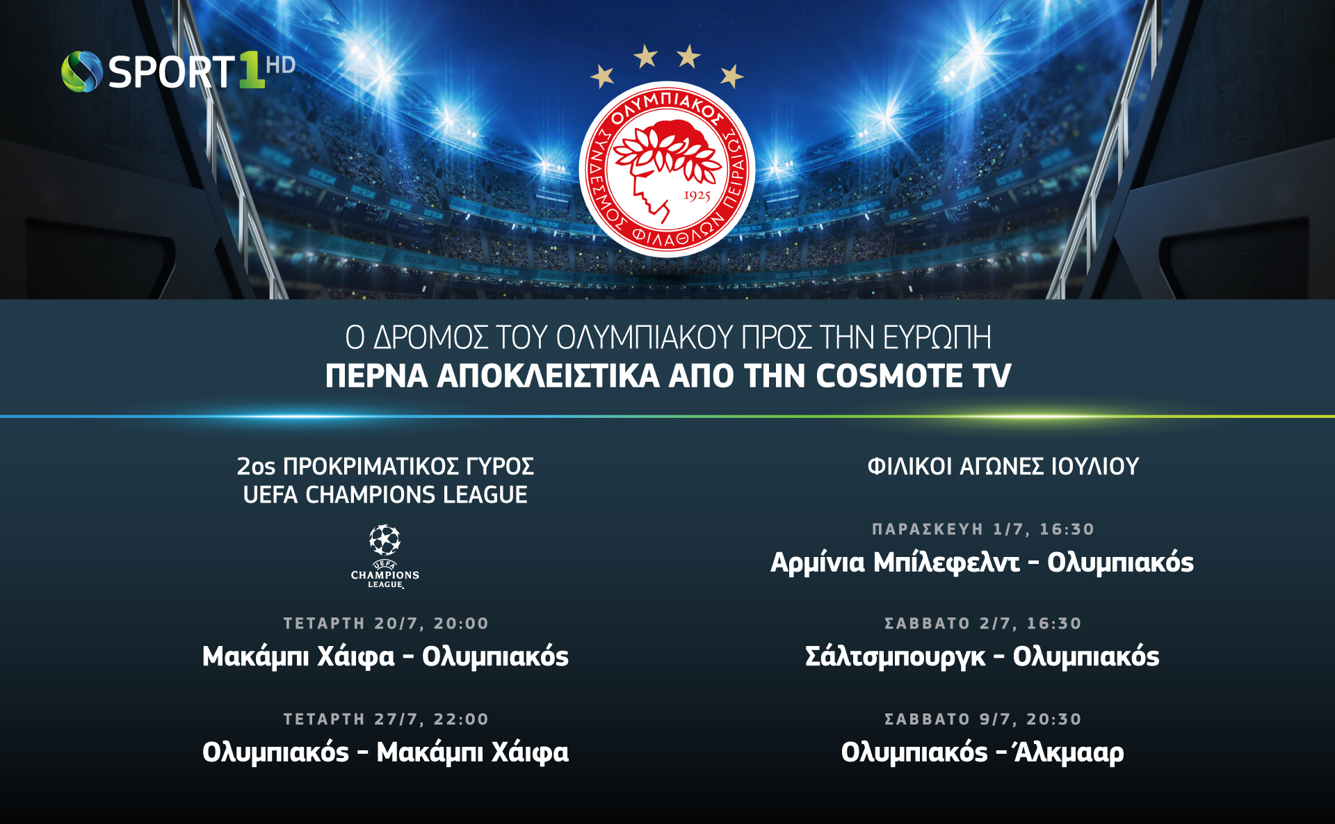 Το COSMOTE SPORT1HD θα μεταδώσει ζωντανά και αποκλειστικά και τις δύο αναμετρήσεις των Πρωταθλητών Ελλάδας απέναντι στην Μακάμπι Χάιφα. Το πρώτο «ραντεβού» των δύο ομάδων έχει οριστεί για την Τετάρτη 20 Ιουλίου στις 20:00 στο Ισραήλ, ενώ η ρεβάνς θα διεξαχθεί μία εβδομάδα αργότερα, Τετάρτη 27 Ιουλίου στις 22:00, στο «Γεώργιος Καραϊσκάκης».