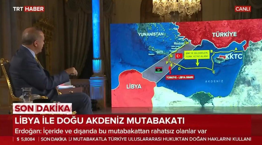 Ο Ρετζέπ Ταγίπ Ερντογάν υποστήριξε ότι η Τουρκία έχει αντικριστές ακτές με τη Λιβύη, όπως απαιτεί το διεθνές δίκαιο της θάλασσας, το οποίο και εφάρμοσε, κι αυτό έκανε την Ελλάδα να τρελαθεί.