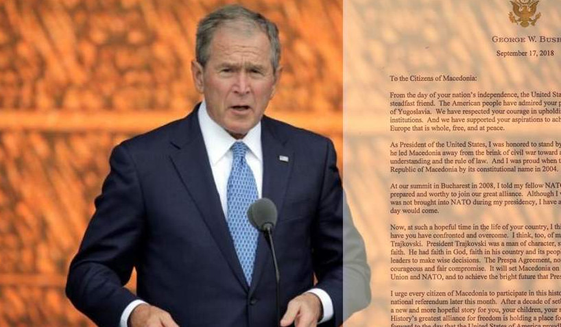 Ως έναν «γενναίο και δίκαιο συμβιβασμό» χαρακτηρίζει τη συμφωνία των Πρεσπών για την ονομασία της ΠΓΔΜ ο πρώην πρόεδρος των ΗΠΑ, Τζορτζ Μπους ο νεότερος και απευθύνει κάλεσμα στους «πολίτες της Μακεδονίας» να ψηφίσουν «Ναι» στο δημοψήφισμα.