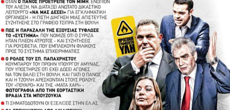 Σύμφωνα με την εφημερίδα, σε απολύτως ιταμό ύφος, ο τότε υπουργός Αμύνης Πανος Καμμένος απαιτούσε την εξωθεσμική παρέμβαση του τότε υπουργού Δικαιοσύνης Δ. Παπαγγελόπουλο (μπροστά στον Τσίπρα) για να… συλληφθούν, ο εκδότης της εφημερίδας Γιάννης Κουρτάκης και ο γενικός διευθυντής της Παναγιώτης Τζένος.