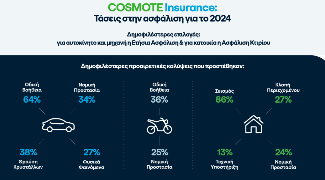 Οι τάσεις και τα δημοφιλέστερα πακέτα που επέλεξαν οι πελάτες του COSMOTE Insurance το 2024 για την ασφάλιση αυτοκινήτου, μηχανής & κατοικίας