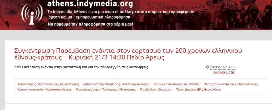 Σε συγκέντρωση παρέμβαση ενάντια στον εορτασμό των 200 χρόνων ελληνικού έθνους-κράτους καλούν “αλληλέγγυοι” την Κυριακή μέσω Indymedia.