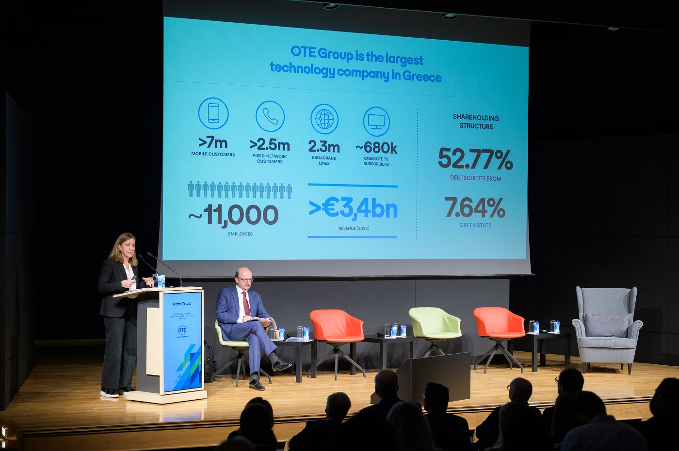 Η κα Ντέπη Τζιμέα είναι μέλος της εξωτερικής συμβουλευτικής επιτροπής του Executive MBA από το 2023, η οποία απαρτίζεται από εκπροσώπους του δημόσιου και του ιδιωτικού τομέα. Κατά τη διάρκεια της ημερίδας, η κα Τζιμέα αναφέρθηκε στο στόχο του Ομίλου ΟΤΕ να αποτελεί κορυφαία εταιρεία τεχνολογίας με επίκεντρο της επιχειρηματικής λειτουργίας τη βιώσιμη ανάπτυξη. Συγκεκριμένα, περιέγραψε τη διαδρομή και τη στρατηγική προσέγγιση που ακολούθησε ο Όμιλος τα τελευταία 10 χρόνια, καθώς και τον τρόπο με τον οποίο αντιμετωπίζει τις σύγχρονες προκλήσεις στον τομέα αυτό.