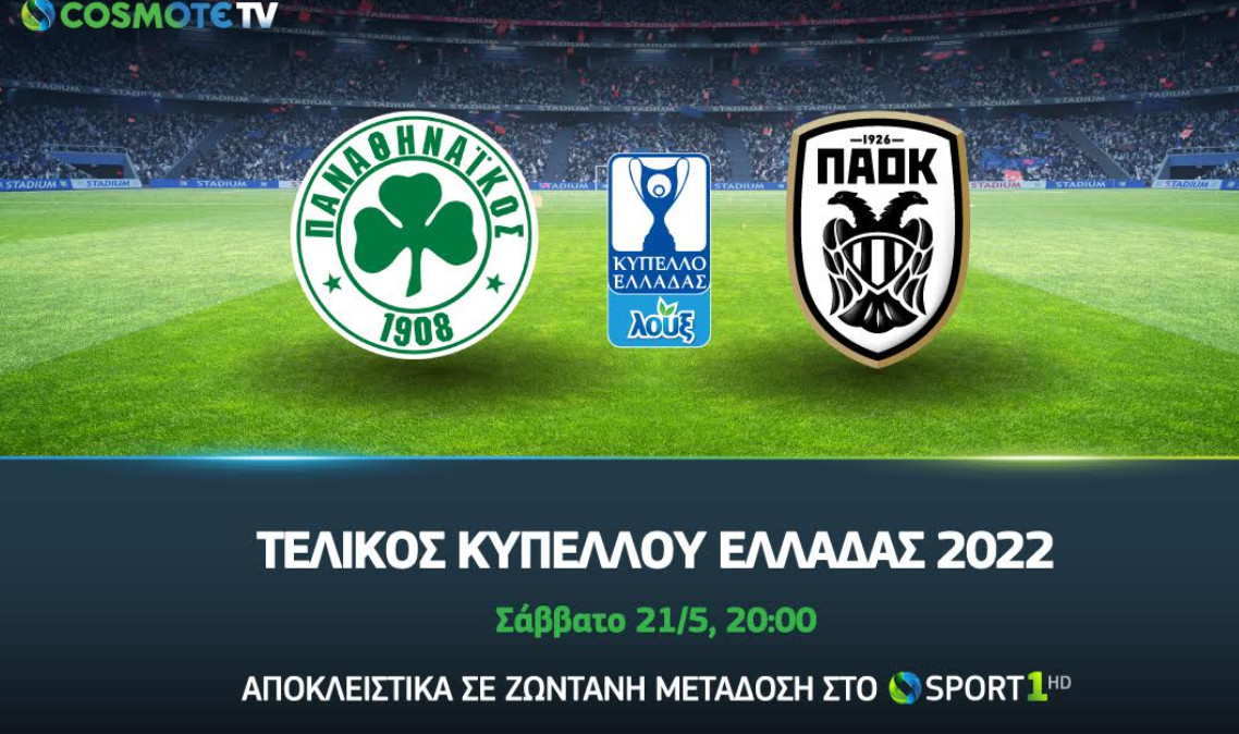 Η «κούρσα» για την ανάδειξη του Κυπελλούχου Ελλάδας ολοκληρώνεται το Σάββατο 21/5 αποκλειστικά σε ζωντανή μετάδοση στην COSMOTE TV, με τη μονομαχία Παναθηναϊκού και ΠΑΟΚ να επαναλαμβάνεται έπειτα από 8 χρόνια σε τελικό του θεσμού.