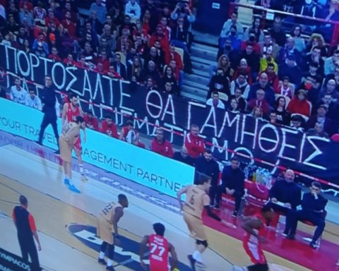 Το πανό φέρει το σύνθημα «Μακεδόνες ψηλά το κεφάλι» και έχει τοποθετηθεί σε οκταώροφη πολυκατοικία απέναντι από το ξενοδοχείο.
