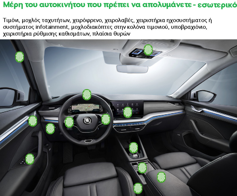 Πάρτε τον καθαρισμό αυτόν πολύ σοβαρά: Μην ξεχάσετε την απολύμανση του τιμονιού, του επιλογέα ταχυτήτων, του χειρόφρενου, των χειρολαβών στις πόρτες, των χειριστηρίων του ηχοσυστήματος και του συστήματος infotainment, τους μοχλοδιακόπτες στην κολόνα του τιμονιού (φλας και υαλοκαθαριστήρες, πιθανά cruise control), τα υποβραχιόνια, τους διακόπτες ρύθμισης των καθισμάτων, τα πλαίσια των θυρών και τις εξωτερικές τους χειρολαβές, καθώς και τη χειρολαβή του πορτμπαγκάζ. Οι αρχές αυτές είναι ακόμη πιο σημαντικές για τους οδηγούς ταξί και άλλους οδηγούς που μετακινούν επιβάτες.