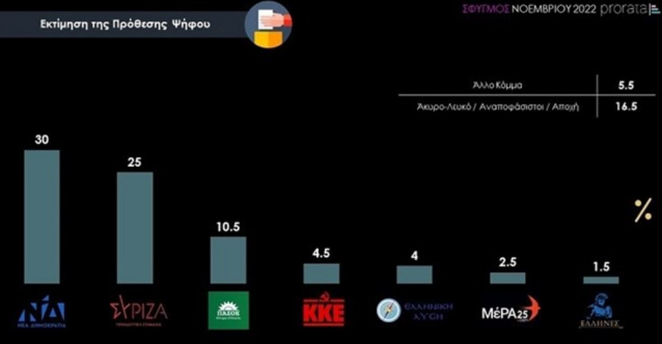 Με 5 μονάδες διαφορά προηγείται η Νέα Δημοκρατία του ΣΥΡΙΖΑ-ΠΣ στην πρόθεση ψήφου, με την ικανοποίηση από το κυβερνητικό έργο να παραμένει χαμηλή αλλά με τα κόμματα της αντιπολίτευσης την ίδια στιγμή να μην καρπώνονται στην κοινωνική δυσαρέσκεια και να να αξιολογούνται ακόμα πιο αρνητικά ως προς το δικό τους αντιπολιτευτικό έργο, σσύμφωνα με τον Σφυγμό Νοεμβρίου 2022, την τελευταία μέτρηση ανίχνευσης πολιτικών στάσεων και εκλογικής συμπεριφοράς της Prorata.