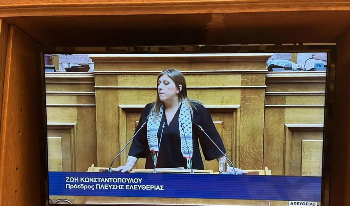 Με παλαιστινιακή «μαντίλα» εμφανίστηκε στο βήμα της Βουλής η Ζωή Κωνσταντοπούλου, κατά τη διάρκεια της επετειακής αναφοράς, στη μνήμη του αγωνιστή της Δημοκρατίας και της Ειρήνης, Γρηγόρη Λαμπράκη.