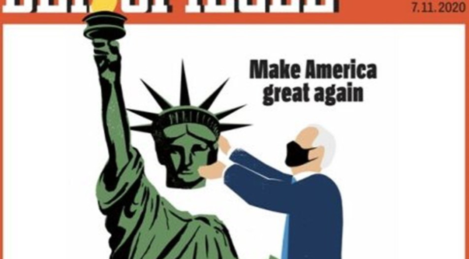 Στην χθεσινή του ψηφιακή έκδοση, μετά την νίκη του Τζο Μπάιντεν στις εκλογές της 3ης Νοεμβρίου, το γερμανικό εβδομαδιαίο περιοδικό φιλοξένησε σκίτσο του ίδιου δημιουργού, αυτή τη φορά να δείχνει τον Δημοκρατικό νέο πρόεδρο των ΗΠΑ να βάζει πίσω στη θέση του το κεφάλι του Αγάλματος της Ελευθερίας. Με λεζάντα: “Κάντε την Αμερική Σπουδαία Ξανά”, το χαρακτηριστικό σλόγκαν του Τραμπ.
