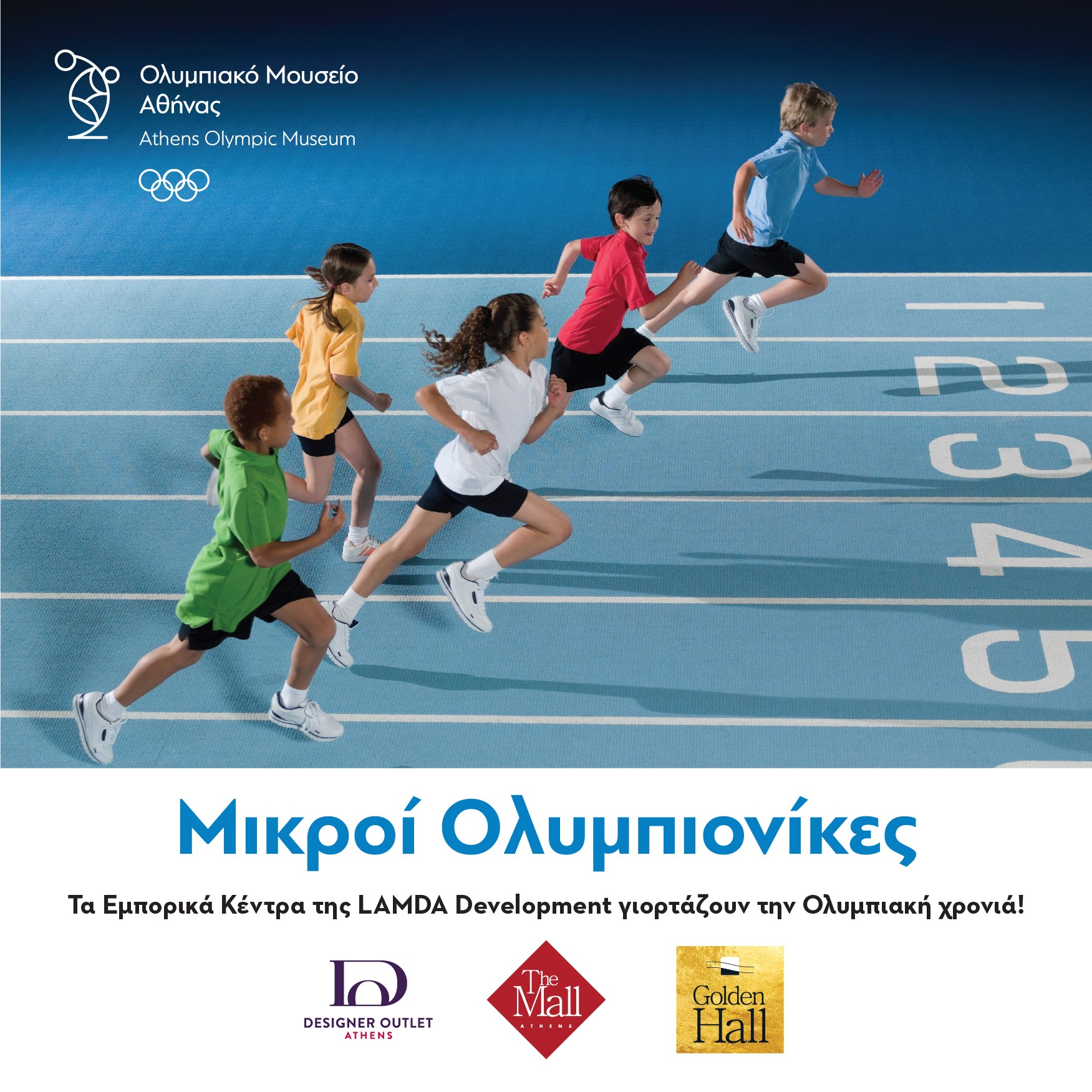 Φέτος το καλοκαίρι, το Ολυμπιακό Μουσείο Αθήνας και τα Εμπορικά Κέντρα της LAMDA Development σας προσκαλούν, μέσω της δράσης «Μικροί Ολυμπιονίκες», σε μία διασκεδαστική γιορτή για παιδιά, αφιερωμένη στους Ολυμπιακούς Αγώνες.