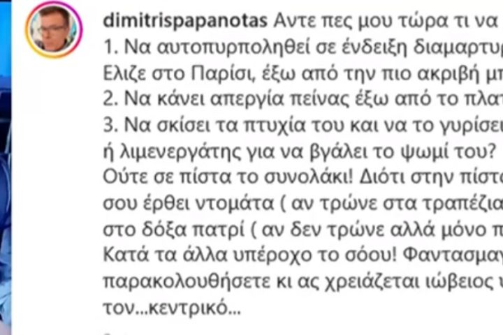 Lifestyle·Τηλεόραση - Showbiz 19/02 Ο Δ. Παπανώτας «καρφώνει» τον Ν. Κοκλώνη – Ούτε σε πίστα το συνολάκι! «Ούτε σε πίστα το συνολάκι! Διότι στην πίστα κινδυνεύεις να σου έρθει ντομάτα ή κανά ποτήρι στο δόξα πατρί», έγραψε μεταξύ άλλων ο Δημήτρης Παπανώτας.