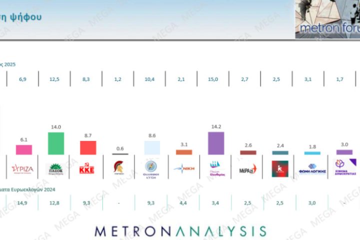 Σημαντικά κέρδη 2,9 μονάδων στην εκτίμηση ψήφου σε σχέση με τον Απρίλιο καταγράφει η ΝΔ στη μέτρηση της Metron Analysis που παρουσιάστηκε στο κεντρικό δελτίο του Mega.