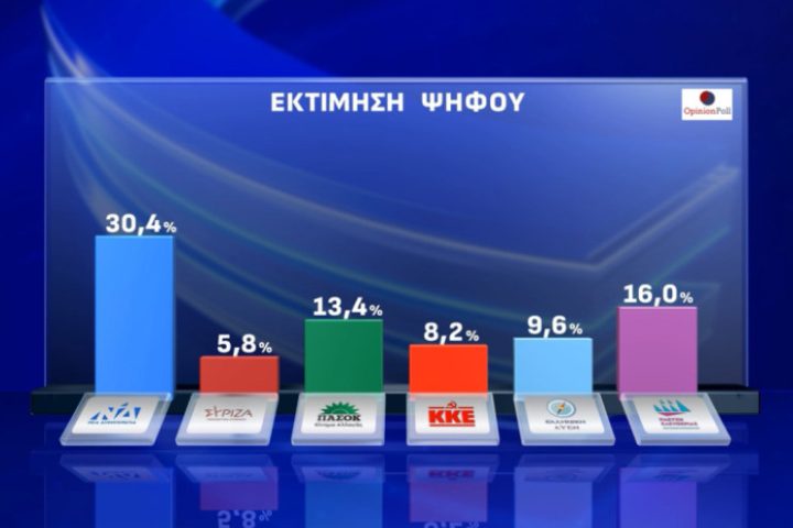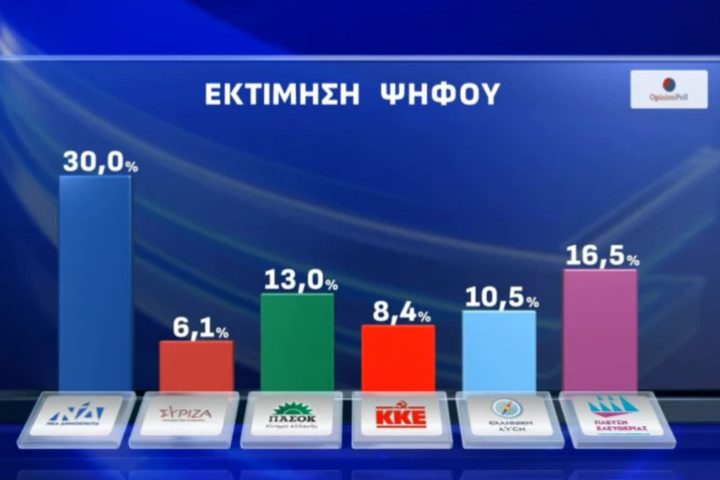 Opinion Poll: Κυριαρχία της ΝΔ στην εκτίμηση ψήφου με 30,1% – Συνεχίζει να “γκρεμίζεται” η Πλεύση Ελευθερίας