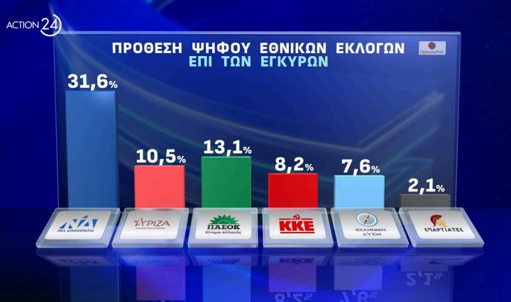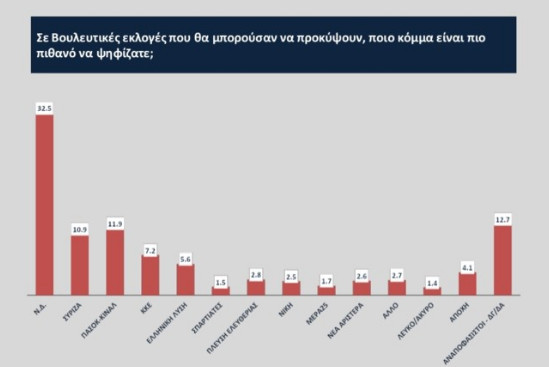 Στην πρόθεση ψήφου η Νέα Δημοκρατία συγκεντρώνει ποσοστό 39,1%, ο ΣΥΡΙΖΑ 17,3%, το ΠΑΣΟΚ 12,3%, το ΚΚΕ 8,7%, η Ελληνική Λύση 4,0%, οι Σπαρτιάτες 3,6%, η Πλεύση Ελευθερίας 3,4% και η Νίκη