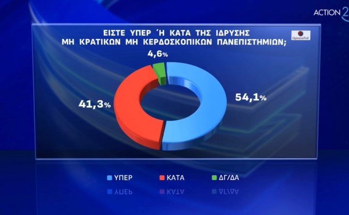 Επιβεβαιώνει η μέτρηση της Opinion Poll που παρουσιάστηκε στο κεντρικό δελτίο του Action 24 το ότι η πλειονότητα της ελληνικής κοινωνίας επικροτεί την ίδρυση μη κρατικών πανεπιστημίων που φέρνει το νομοσχέδιο Πιερρακάκη: