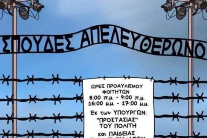 Σκίτσο της "Εφημερίδας των Συντακτών", συγκρίνονται οι μεταρρυθμίσεις που προωθούνται από την κυβέρνηση για τα ΑΕΙ με το ναζιστικό στρατόπεδο συγκέντρωσης