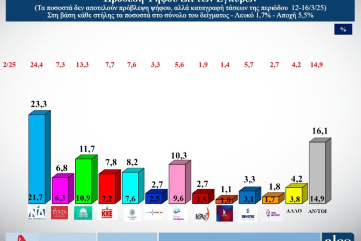 ALCO: Στις 11,3 μονάδες το προβάδισμα της ΝΔ, 2ο με πτώση το ΠΑΣΟΚ – 6ος ο ΣΥΡΙΖΑ