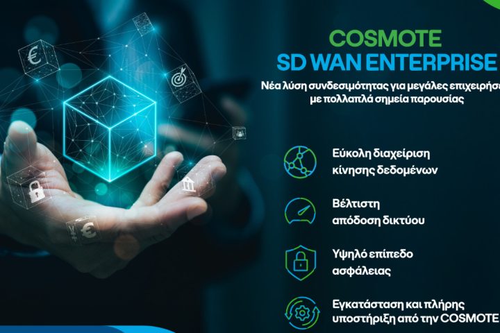Η COSMOTE εμπλουτίζει το portfolio των λύσεων συνδεσιμότητας SD-WAN (Software – Defined Wide Area Network) που προσφέρει, με τη νέα υπηρεσία COSMOTΕ SD WAN Enterprise για μεγάλες επιχειρήσεις με πολλαπλά σημεία παρουσίας,