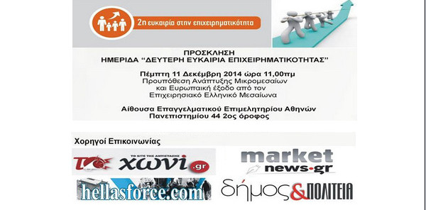Δεύτερη Ευκαιρία Επιχειρηματικότητας… Xορηγός επικοινωνίας το ΜΝ Στις 11/12/2014, ημέρα Πέμπτη, ώρα 11:00πμ θα πραγματοποιηθεί εκδήλωση με θέμα: « ΔΕΥΤΕΡΗ ΕΥΚΑΙΡΙΑ ΕΠΙΧΕΙΡΗΜΑΤΙΚΟΤΗΤΑΣ» 08/12 Ελλάδα·Οικονομία