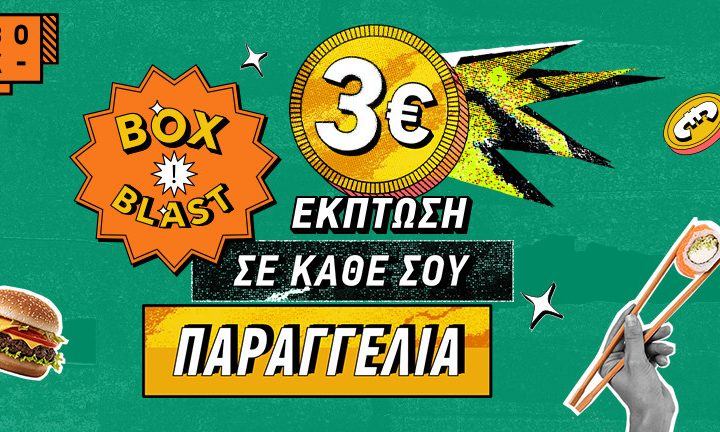 Ελλάδα·Επιχειρήσεις 24/01 BOX BLAST:Έκπτωση 3€ σε κάθε παραγγελία στο BOX To BOX Delivery App επιστρέφει με την προσφορά ΒΟΧ BLAST, που δίνει έκπτωση 3€ σε κάθε παραγγελία φαγητού, καφέ ή και γλυκού σε όλους τους χρήστες του. Για ακόμα μία φορά οι