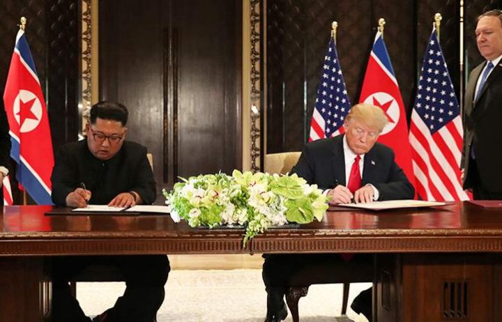 Κόσμος·Πολιτική 12/06 «Εγγυήσεις ασφαλείας» και «πλήρης αποπυρηνικοποίηση» υπέγραψαν Τραμπ – Κιμ Ο πρόεδρος των ΗΠΑ Ντόναλντ Τραμπ και ο ηγέτης της Βόρειας Κορέας Κιμ Γιονγκ Ουν κάθισαν μαζί στο τραπέζι