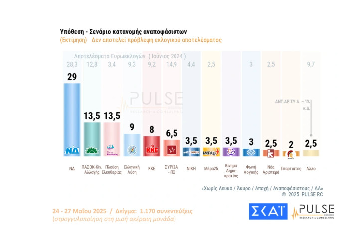 Pulse: Στις 15,5 μονάδες – μισή μονάδα πάνω σε σχέση με τον Απρίλιο το προβάδισμα της ΝΔ