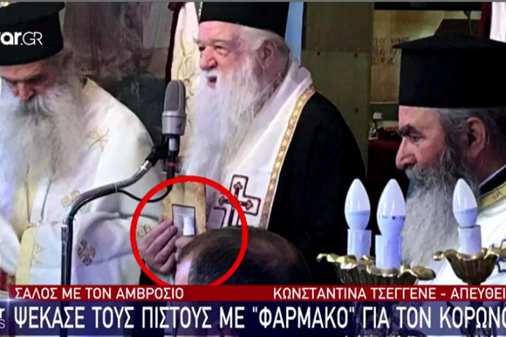 Ελλάδα·Επικαιρότητα 30/08 Σάλος με τον Αμβρόσιο: Ψέκασε τους πιστούς με “φάρμακο” για τον κορωνοϊό Με ένα ψεκαστήρι στα χέρια και λέγοντας ότι αυτό είναι το φάρμακο κατά του κορωνοϊού ο πρώην μητροπολίτης Αιγιαλείας και Καλαβρύτων Αμβρόσιος
