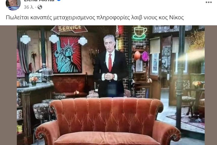 Το σαρκαστικό σχόλιο της Ακρίτα για τον Ευαγγελάτο: Πωλείται καναπές μεταχειρισμένος πληροφορίες λαιβ νιους κος Νίκος Ο Ευαγγελάτος “μπήκε” στο Central Perk και έγινε viral – Το καυστικό σχόλιο της Έλενας Ακρίτα. 30/10 Lifestyle·Τηλεόραση - Showbiz