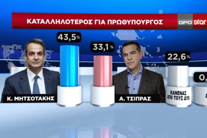 Στο 7,4% βρίσκεται η διαφορά μεταξύ της Νέας Δημοκρατίας και του ΣΥΡΙΖΑ, σύμφωνα με δημοσκόπηση της GPO, που διενεργήθηκε για την εφημερίδα «Παραπολιτικά».