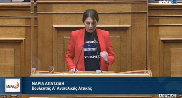 Την εμφάνιση της βουλευτού του ΜέΡΑ25, Μαρίας Απατζίδη, στη Βουλή, η οποία ανέβηκε στο βήμα φορώντας μια πλούζα, που έγραφε «57 νεκροί, 156 υποκριτές» για την τραγωδία στα Τέμπη, σχολιάζει με μία σκληρή ανακοίνωση