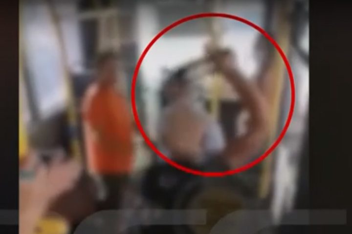 Με ένα μπουκάλι στα χέρια απέναντι από τον οδηγό που έχει σηκωθεί και έχει φτάσει στη μέση του λεωφορείου, μπροστά στους λιγοστούς επιβάτες που παρακολουθούν τις σκηνές που εκτυλίσσονται γύρω τους, ο