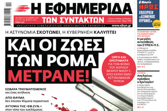 «Η αστυνομία σκοτώνει», αναφέρει σε πρωτοσέλιδό της η Εφημερίδα των Συντακτών για τον θάνατο Ρομά στο Πέραμα μετά από καταδίωξη, προκαλώντας «σάλο» στο Twitter