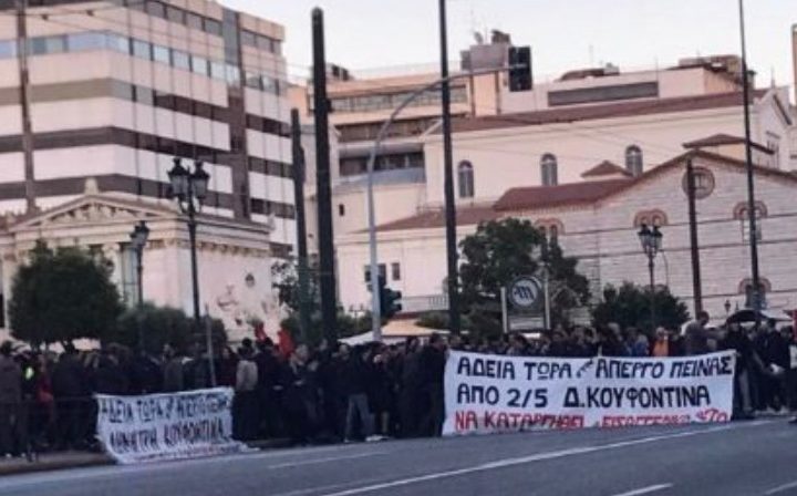 Συγκέντρωση και πορεία αλληλεγγύης προς τον πολυισοβίτη της 17Ν, Δημήτρη Κουφοντίνα, απεργό πείνας εδώ και 19 ημέρες, είναι σε εξέλιξη το απόγευμα της Τρίτης