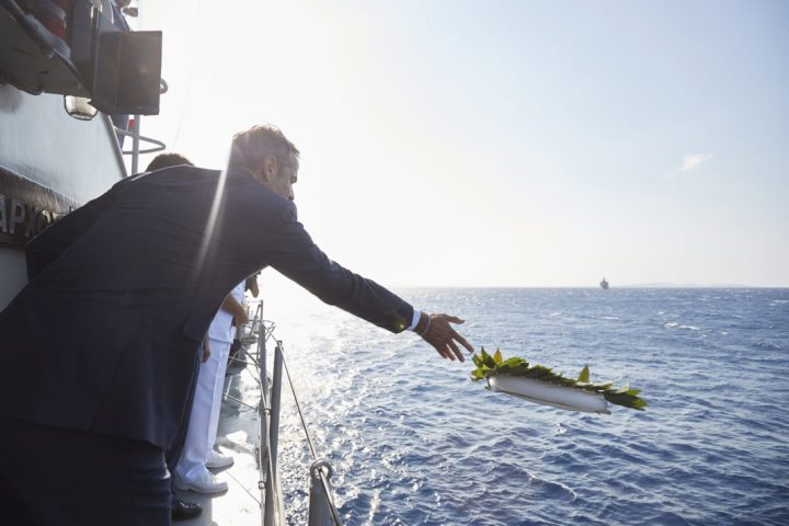 Στεφάνι στον υγρό τάφο του καταδρομικού «Έλλη» που βυθίστηκε στις 15 Αυγούστου του 1940, ανήμερα της Γιορτής της Παναγίας, από το ιταλικό υποβρύχιο «Ντελφίνο» έριξε ο πρωθυπουργός Κυριάκος Μητσοτάκης ο οποίος συμμετέχει