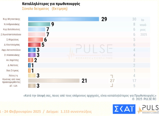 Pulse: Στις 13 μονάδες η διαφορά της ΝΔ – Καταλληλότερος πρωθυπουργός ο Κ. Μητσοτάκης με 29%