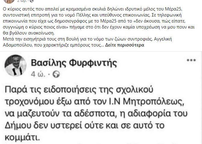 Ο, κατά δική του δήλωση, υπεύθυνος Επικοινωνίας στο νομό Πέλλης και ιδρυτικό μέλος του ΜέΡΑ25, Βασίλης Φυρφιντής, απειλεί, με ανάρτησή του στο facebook, ότι «θα κρεμάσουν ανάποδα αδέσποτα κοπρόσκυλα».