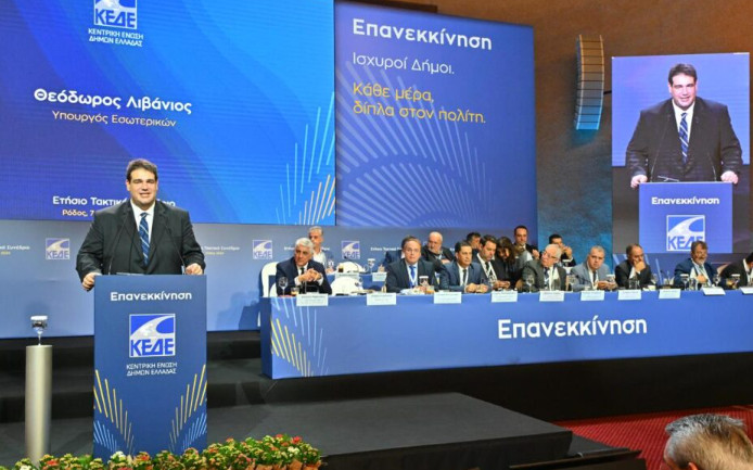 Τους βασικούς άξονες για τη μεταρρύθμιση της Τοπικής Αυτοδιοίκησης παρουσίασε ο Υπουργός Εσωτερικών, Θοδωρής Λιβάνιος, στο ετήσιο συνέδριο της Κεντρικής Ένωσης Δήμων Ελλάδας στη Ρόδο, που τελείται υπό την Αιγίδα της Προέδρου της Δημοκρατίας, κας Κατερίνας Σακελλαροπούλου.