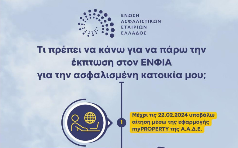 Σε συνέχεια δημοσίευσης του Νόμου 5045/2023 (ΦΕΚ Α’ 136/29.7.2023) και της εφαρμοστικής ΚΥΑ 1014/2024 (ΦΕΚ Β΄743/31.1.2024) για τη μείωση ΕΝΦΙΑ για τις ασφαλισμένες κατοικίες, η ΕΑΕΕ προχώρησε στη δημιουργία ενός χρηστικού εντύπου για τα βήματα που πρέπει να ακολουθήσει ο πολίτης προκειμένου να πάρει την έκπτωση.