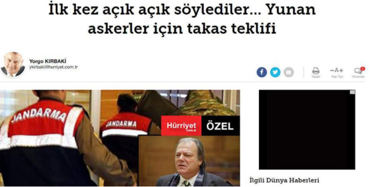 Το άρθρο έχει τον τίτλο «Πρόταση για ανταλλαγή των Ελλήνων με τους Τούρκους στρατιωτικούς» και περιλαμβάνει τις δηλώσεις του Ελληνα βουλευτή αλλά και την αντίδραση του Δημήτρη Καμμένου επίσης βουλευτή των ΑΝΕΛ, ο οποίος κάλεσε τον κ. Κατσίκη να ζητήσει συγγνώμη από τις οικογένειες των δύο Ελλήνων που βρίσκονται στη φυλακή στην Αδριανούπολη.