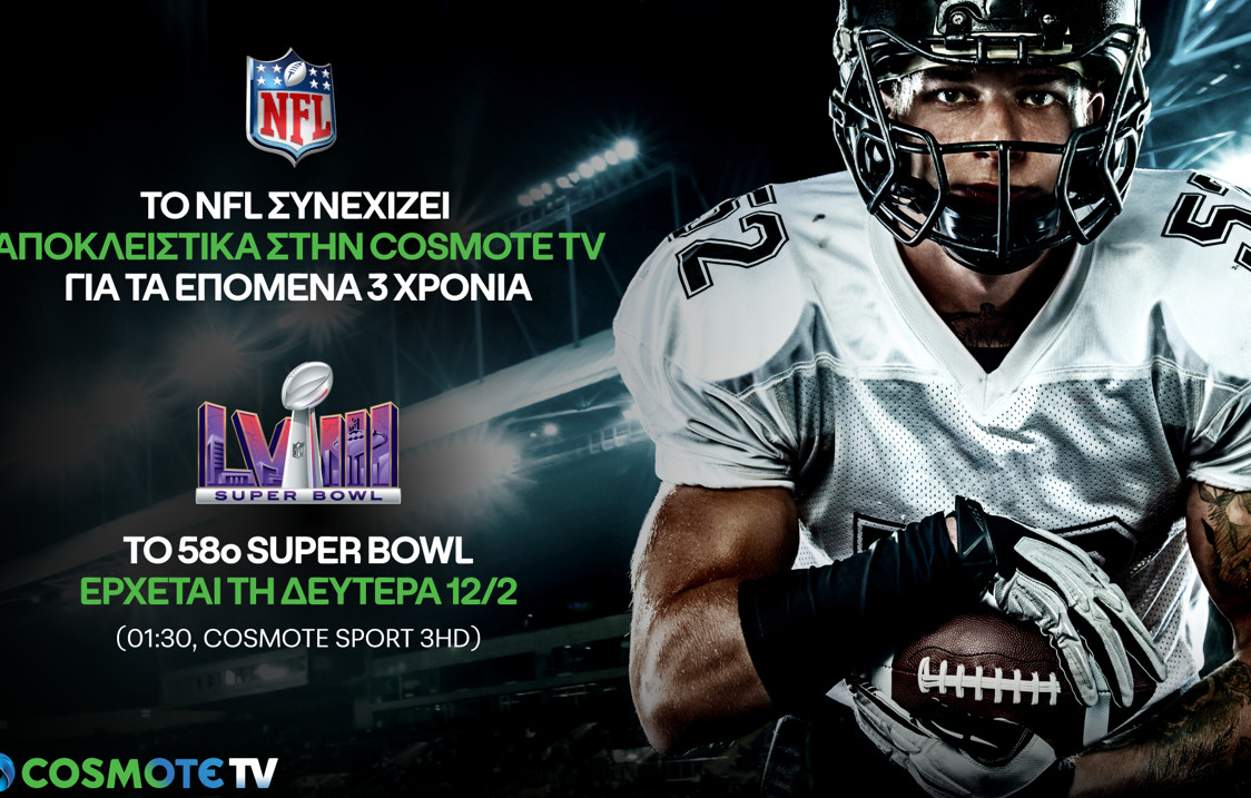 Το 58ο Super Bowl έρχεται ζωντανά και αποκλειστικά στην COSMOTE TV, η οποία ανανέωσε τη συνεργασία της με το NFL και θα συνεχίσει να μεταφέρει πλούσιο θέαμα από το αμερικανικό πρωτάθλημα ποδοσφαίρου για τα επόμενα τρία χρόνια.