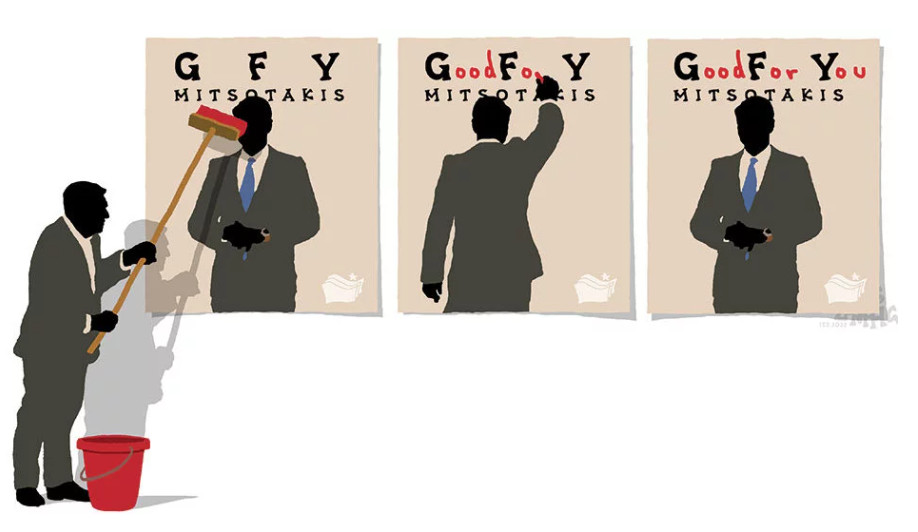 Στο σκίτσο του Δημήτρη Χαντζόπουλου βλέπουμε τον ίδιο τον Αλέξη Τσίπρα να τοιχοκολλάει αφίσα, με το σήμα του ΣΥΡΙΖΑ, στην οποία εικονίζεται ο πρωθυπουργός. «GFY Mitsotakis», γράφει με μεγάλα γράμματα. Ο πρωθυπουργός «ζωντανεύει» στην υβριστική αφίσα, γυρίζει και αλλάζει το σύνθημα σε «Good For You Μitsotakis» -Καλός για εσάς ο Μητσοτάκης. Συμπέρασμα, οι ύβρεις και οι χυδαιολογίες γυρίζουν μπούμερανγκ στους εμπνευστές τους και ωφελούν τον πρωθυπουργό, όχι αυτούς που τις εκτοξεύουν.